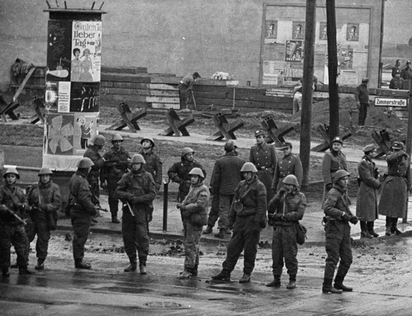 Foto de archivo de diciembre de 1961. Soldados de la RDA vigilan el sector ruso, en Friedrichstrasse, mientras un grupo de obreros trabaja en la construcción del Muro. Corbi