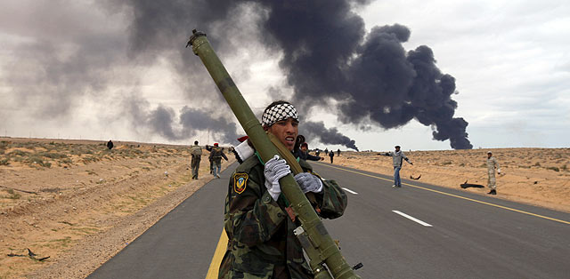 Las fuerzas aéreas de Muamar Gadafi han bombardeado de nuevo la ciudad de Ajdabiya, la última ciudad importante en poder de los rebeldes antes de Bengasi, en el este del país, y alcanzaron vehículos civiles, según un corresponsal de la cadena catarí Al Yazira.